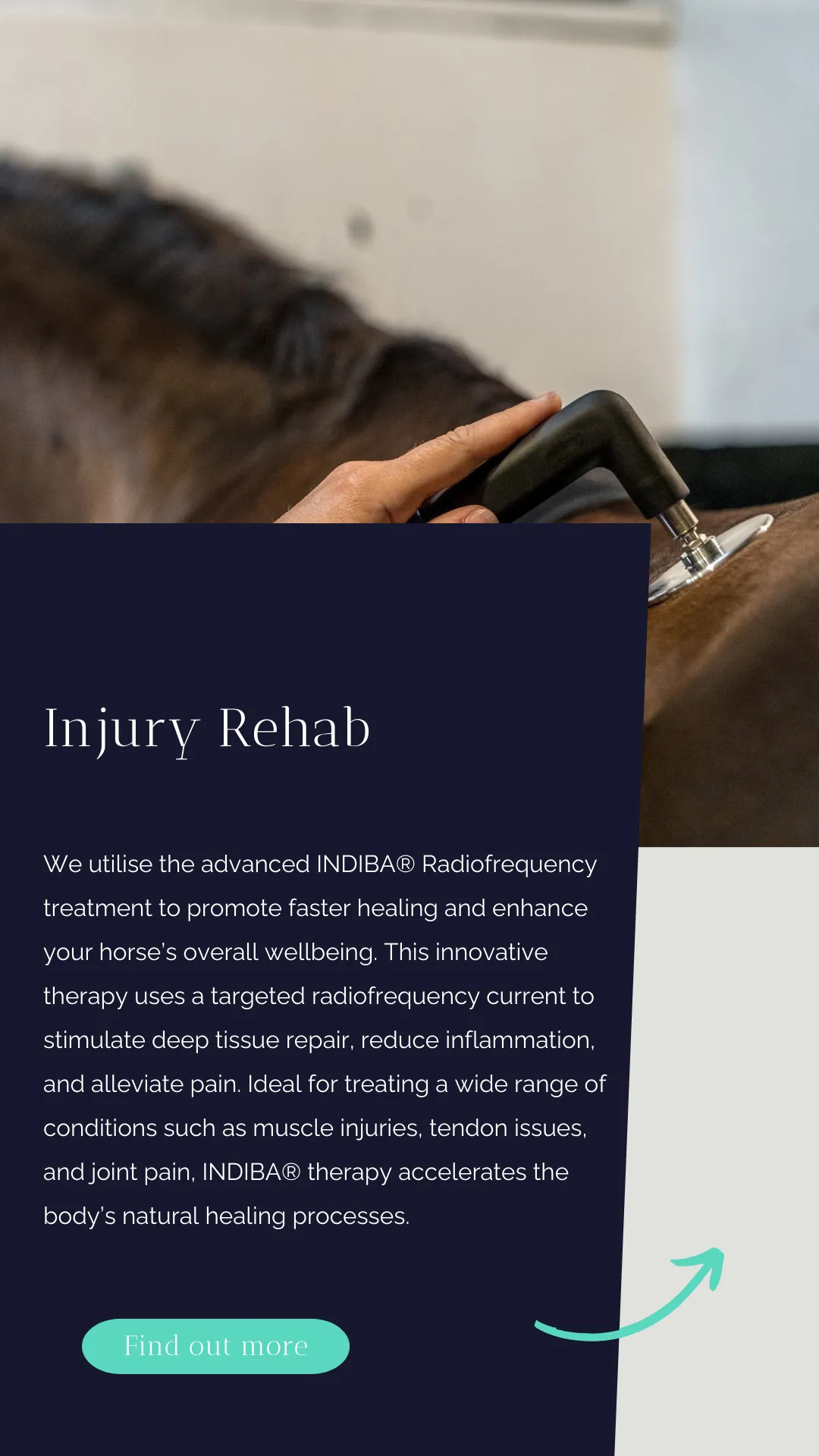 We offer a handful of intense Indiba rehabilitation livery spots. To find out more about our availability contact Carole on 07960 583709